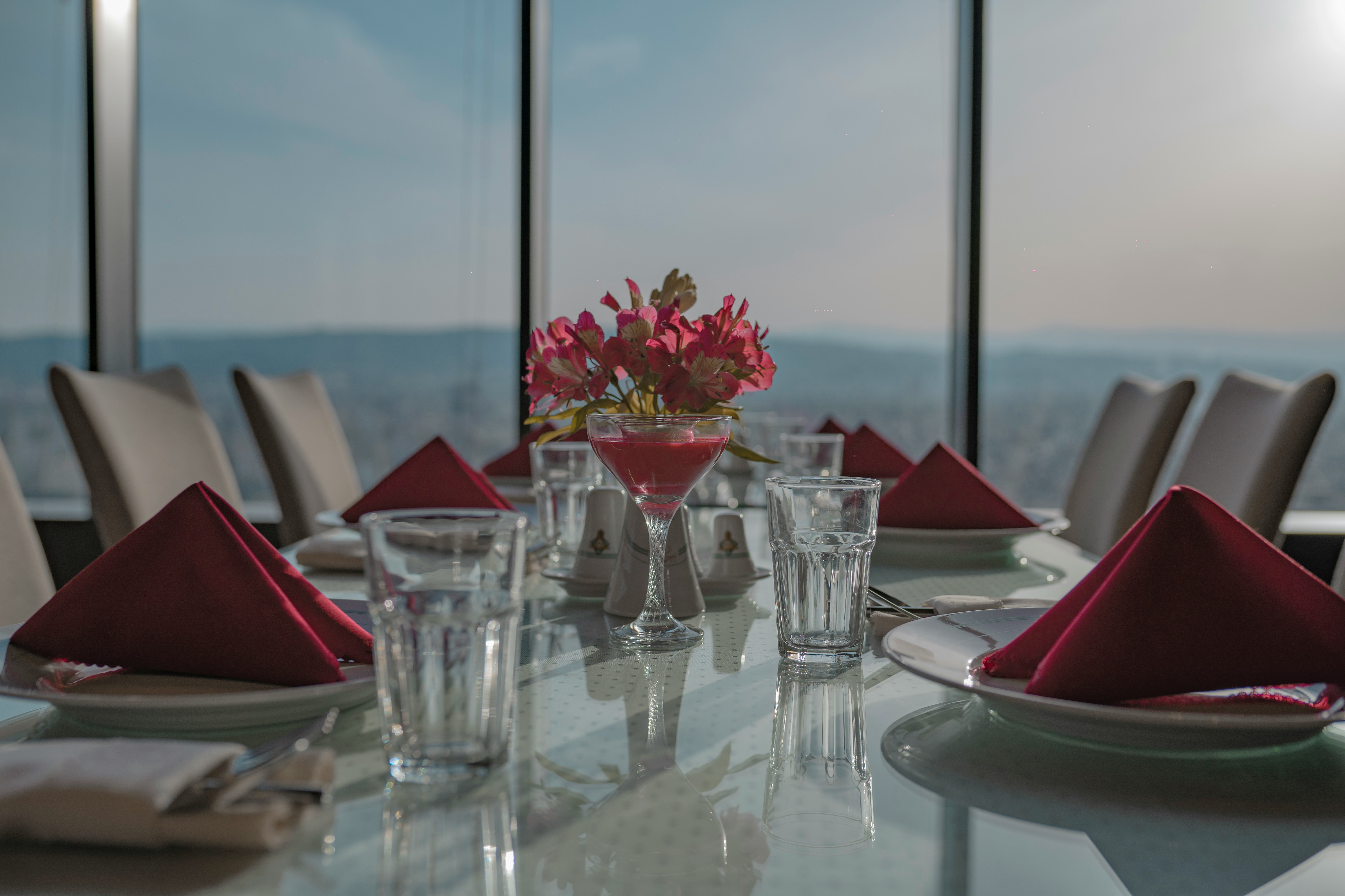Theatrical presentations high above the skyline, with floor-to-ceiling glass and Thiesco three stars.